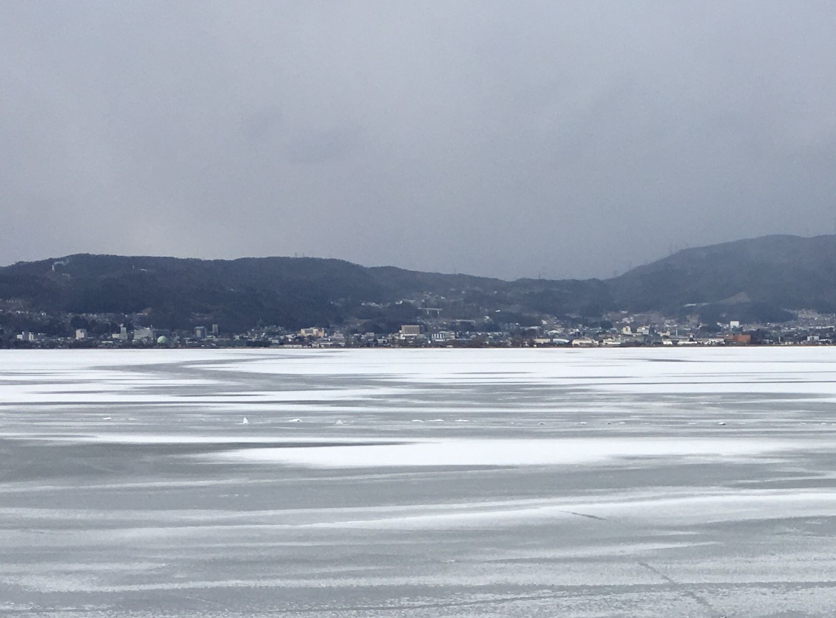 御神渡りの突端になる、諏訪市豊田の湖畔へ行ってみました。耳ちぎれるほど寒かった。