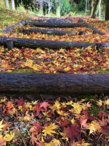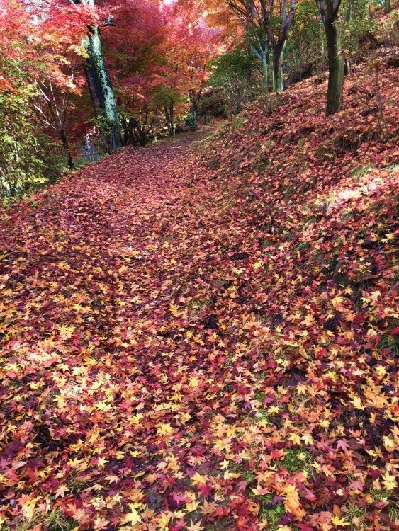落ち葉の小道は、山頂に向かって続いているようです。