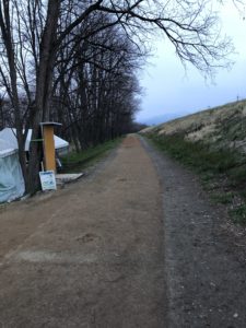 前回記録2時間26分03秒は当然越えるとして、男子平均の2時間を目標に励みます。鍛錬場は、住処裏の三本柳の土手、犀川南運動場から丹波島橋までの往復(およそ3.3km)のコース。コチラ。