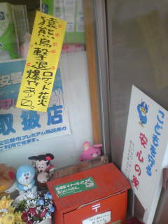 「初秋の農村地帯でのポスティング。ふと雑貨店の軒先をみると、『猿熊鳥撃退ロケット花火爆竹あります』と張り紙が。