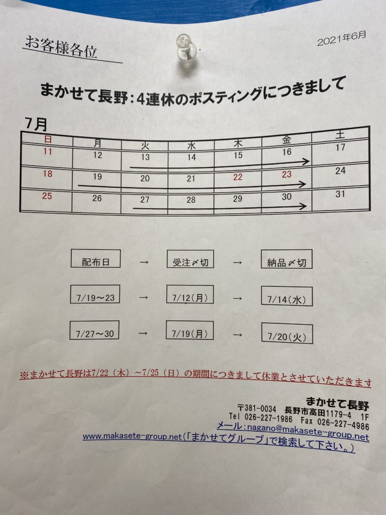 まかせて長野の7月4連休のスケジュール! 地元長野市のポスティング専門企業 まかせて長野 | 配布日記 & 最新情報 2021年7月8日 2026 07.08 みなさん、カレンダーこんな風に?なってませんか? スマホのカレンダーは、いつの間にかしれっと、変更されてましたが・・・ で・・・4連休って、なかなかですよ ポスティングをご依頼の際は、スケジュール確認お願いします(*´ω`*) 共有:Tweet