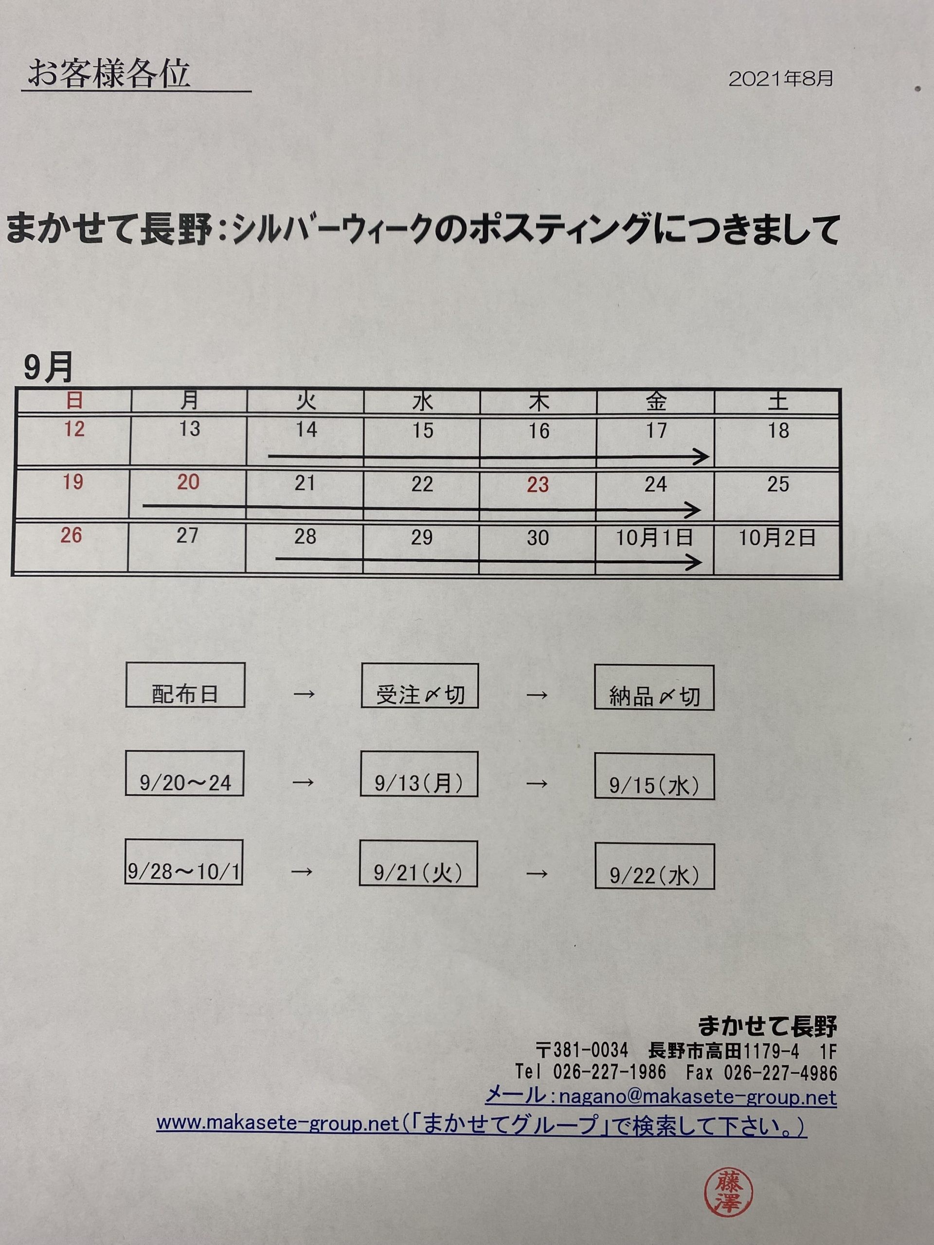 長野市 ポスティングします! シルバーウィークのスケジュール 地元長野市のポスティング専門企業 まかせて長野 | 配布日記 & 最新情報 2021年9月7日 2026 09.07 シルバーウィークのスケジュールです! 祝日が多いのは、嬉しいけど・・・スケジュールがタイトです・・・((+_+)) いつも配布のご依頼をいただきありがとうございます。 よろしくお願いいたします<(_ _)> 共有:Tweet