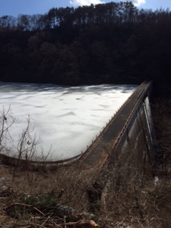 ”牛が伏せる”と書くお寺なので入口には牛がいました!!!近くのダムは氷結していました。