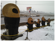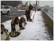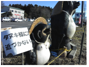 5体のどぶろく酒びんを持ったタヌキ像が並べられていますが、「タヌキ様に近づかないで」の立て看が添えられていました。