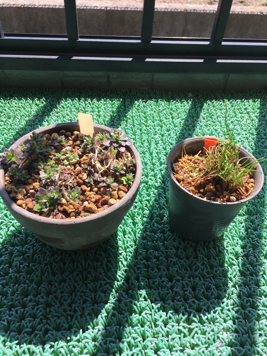 左の鉢が”ムラサキナズナ”、右の鉢が”ミヤマラッキョウ”だそうですっ