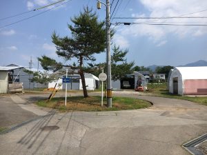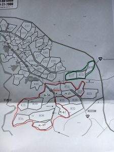 赤で囲まれたところを配布します。緑は予備エリア。