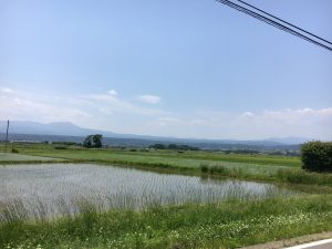 なんとも雄大な景色に囲まれた街。田植えの済んだ風景が癒されます。