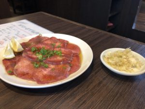 ネギタン塩!!!分厚いタン塩を両面焼き、ごま油の効いたネギを添えて頂きます。