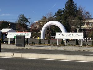「富士河口湖庭園グランドオープン」のバルーンゲートが。レッドカーペットが敷かれ来賓席も多数準備されております。イベントコスチュームを着た綺麗なお姉さんも数名。