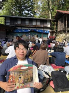 そこで、10月のある日曜日、先輩社員Oさんを誘って、大鹿歌舞伎現物に出かけました。神社の境内に歌舞伎小屋があり、ゴザが敷かれていました。朝早くから多くの村人や見物客が押し寄せていました。正午に幕があがりました。