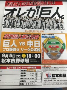 9/5(火)に26年ぶりに松本市営球場で巨人VS中日戦が行われました。