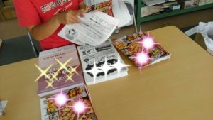 明日の移動配布の準備!! チラシを重ね配りやすいようにセットしています。