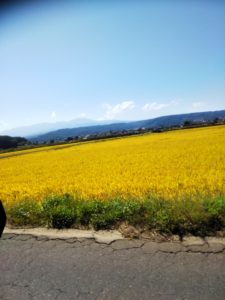 秋の風が吹いております。田んぼには黄金に輝くたわわに実った稲!稲刈りの時期ですね。佐久地域では刈り取った稲を干す‘‘はぜかけ‘‘が行われていました。今日のようにお天気が良い日には脱穀を行っている農家さんもありました!