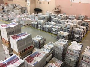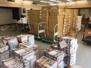 中のチラシを仕分けしてエリアごと並べ、月曜日の昼から配布員さんの手に渡るわけです。