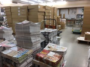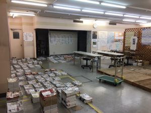 中のチラシを仕分けしてエリアごと並べ、月曜日の昼から配布員さんの手に渡るわけです。