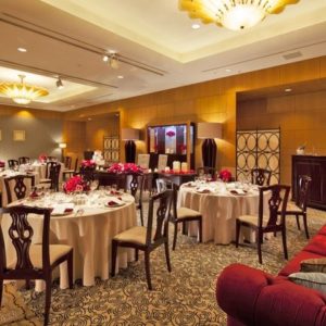 挙式の後はお楽しみ、披露宴でございます。披露宴会場は華やかな装飾と美しい花々で彩られております。