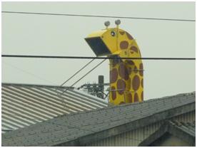 車で移動中に、集落の屋根の上に奇妙な黄色の動物が首を出していました。