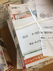 配布員さんのところには、毎週毎週、このビニール紐とあて紙が溜まっていきます。