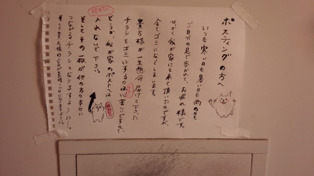 先日、甲斐市のポスティングをしているときに出会った、ステキな「投函拒否」の貼り紙をご紹介します。