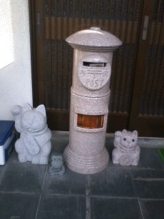 左から招き猫、招きカエル?、ポスト、招き猫。 全て石で作られていました。(石材店ではありません)