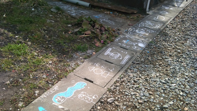 小川の脇の小道を進んでいくと、アートな「らくがき」を発見。