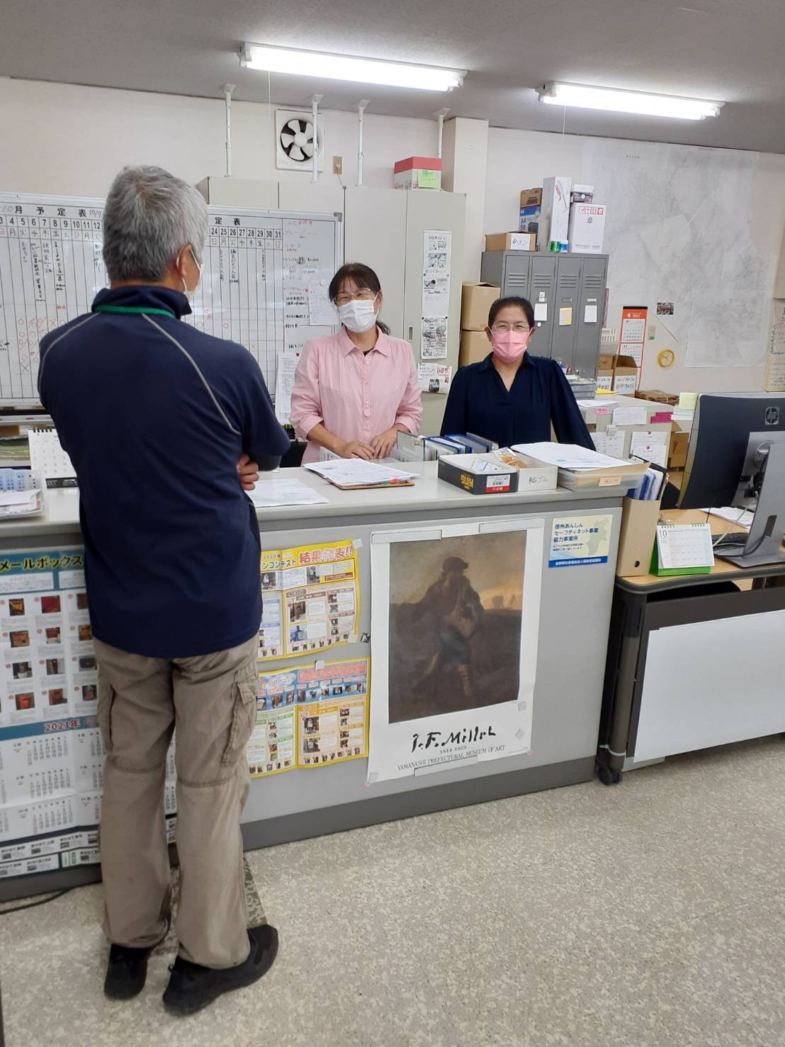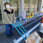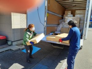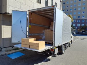 今週のまかせて佐久は、トラックで、段ボール箱60箱の納品がありました。フォークリフトはないので、運転手さんと手運びでの荷受けです。トラックの奥には納品された段ボール箱よりも大きいのが乗っています。どうやらまかせて松本への納品分とのこと。