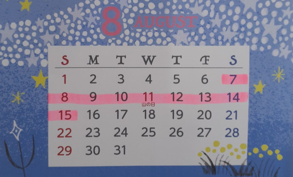8/7(土)~8/15(日)までをお盆(夏休み)とさせていただきます。