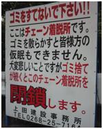 ③本当にゴミ捨てに困っているようですね。建設事務所も必死になって看板を立てていますが、何か文章が変?説得力がありません。チェーン着脱所と仮眠とゴミ捨てと着脱所閉鎖の関連づけに失敗しているような気がするのですけど・・・・。