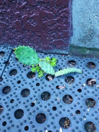 何かと思えばポストの下にサボテンと雑草のコラボレーションで偶然出来たトカゲのような形状。