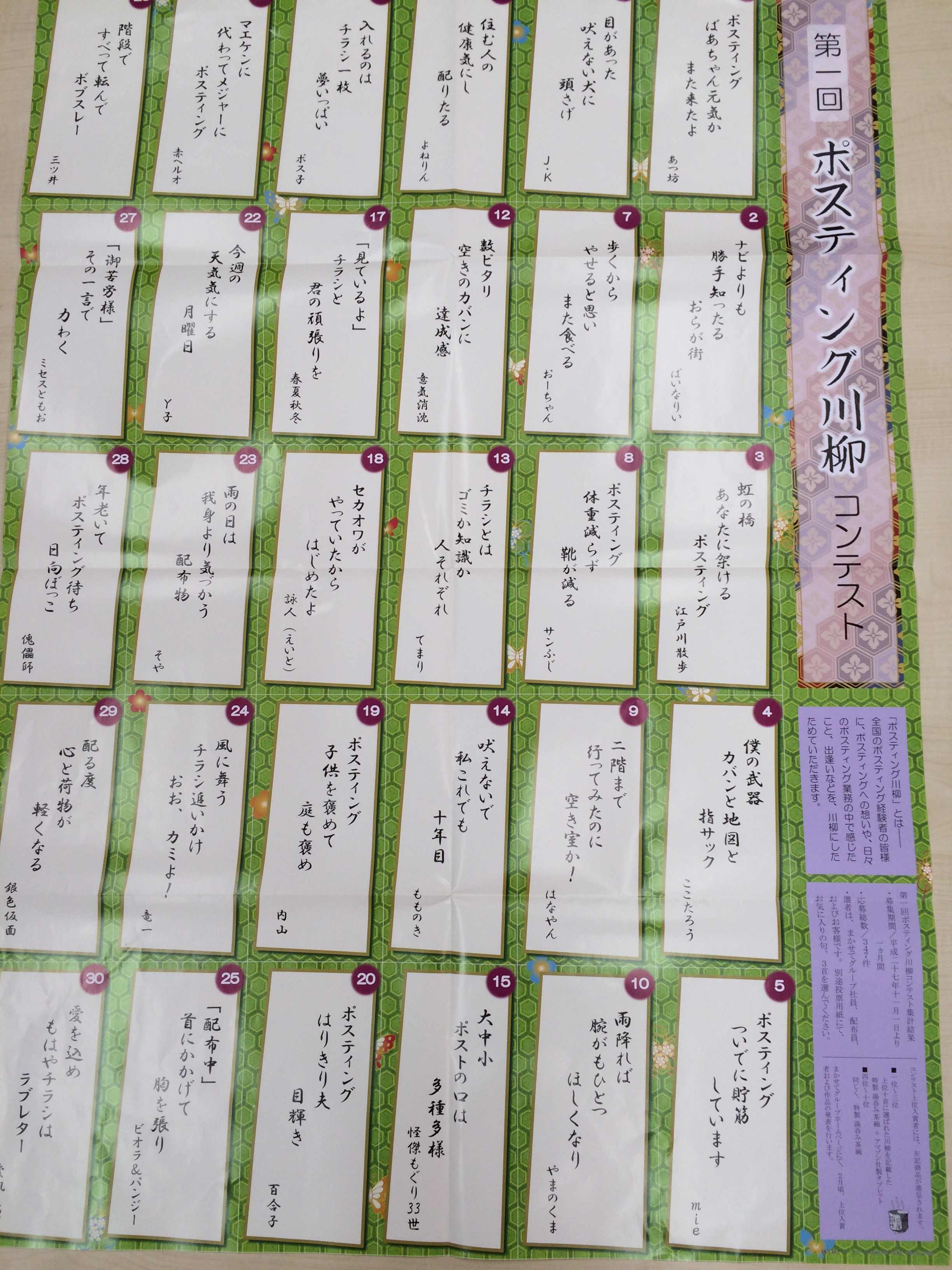 さて、宣伝不足の感があった当コンテストが応募期間1ケ月間で347句が集まったことはどのように考えればいいのでしょうか?応募資格は、ポスティングしたことがある人のみという制限があったにも関わらずこんなにも多くの方が応募してくれました。