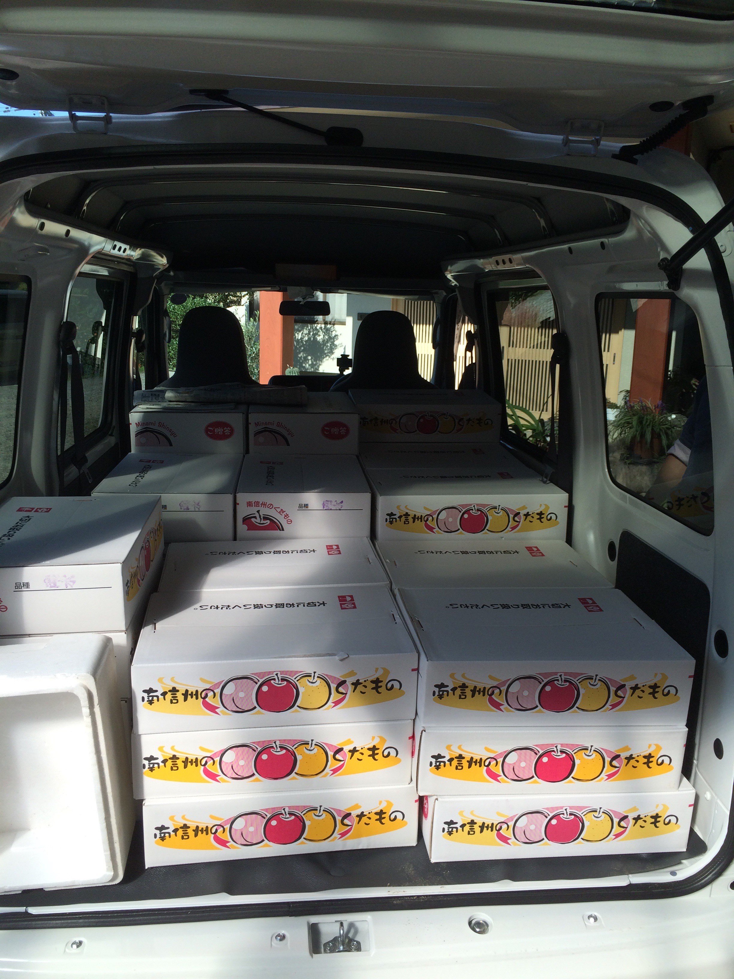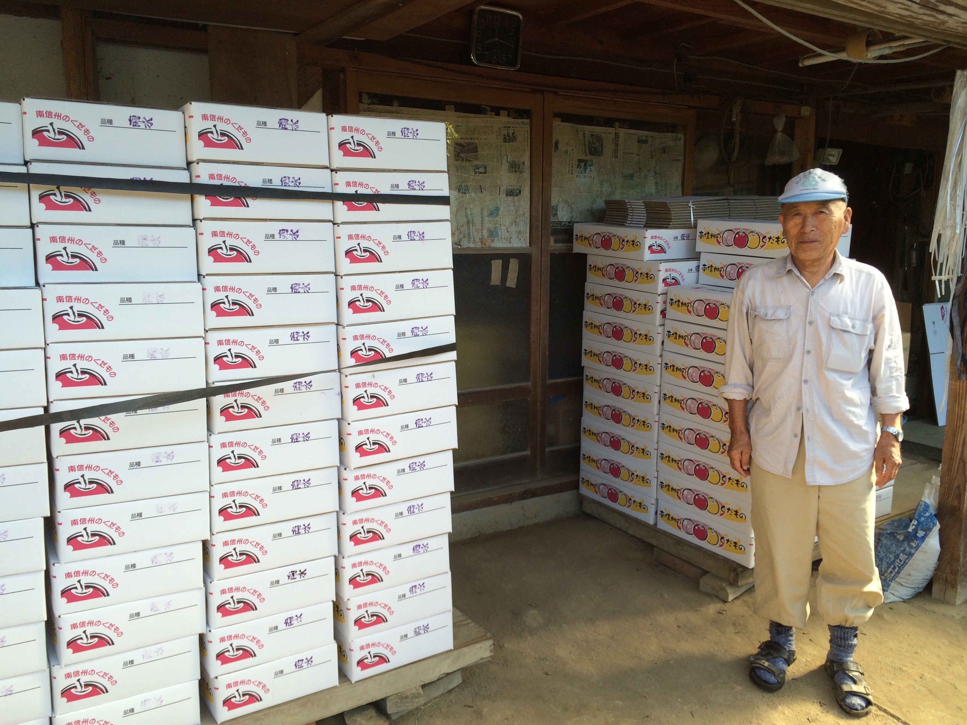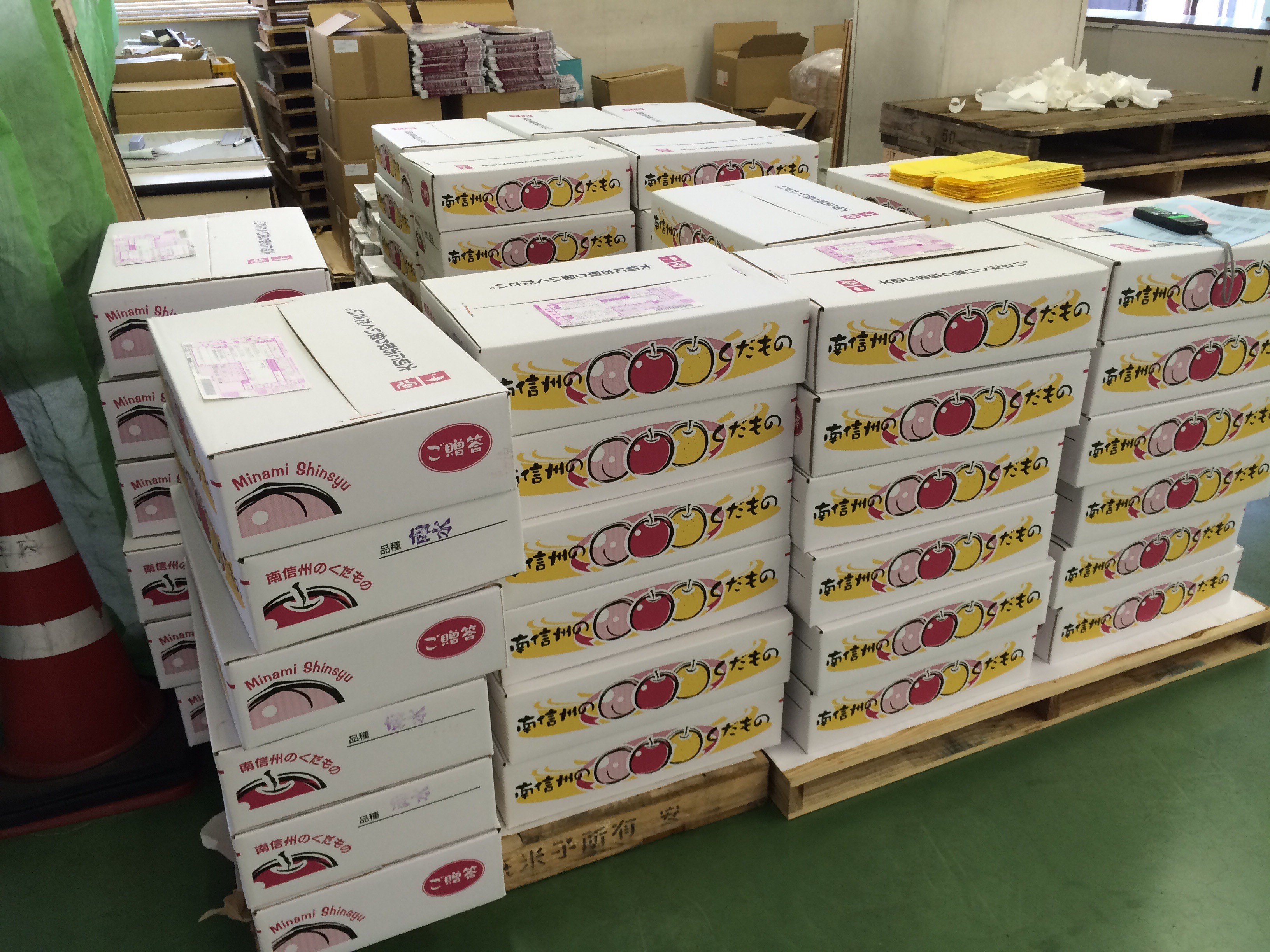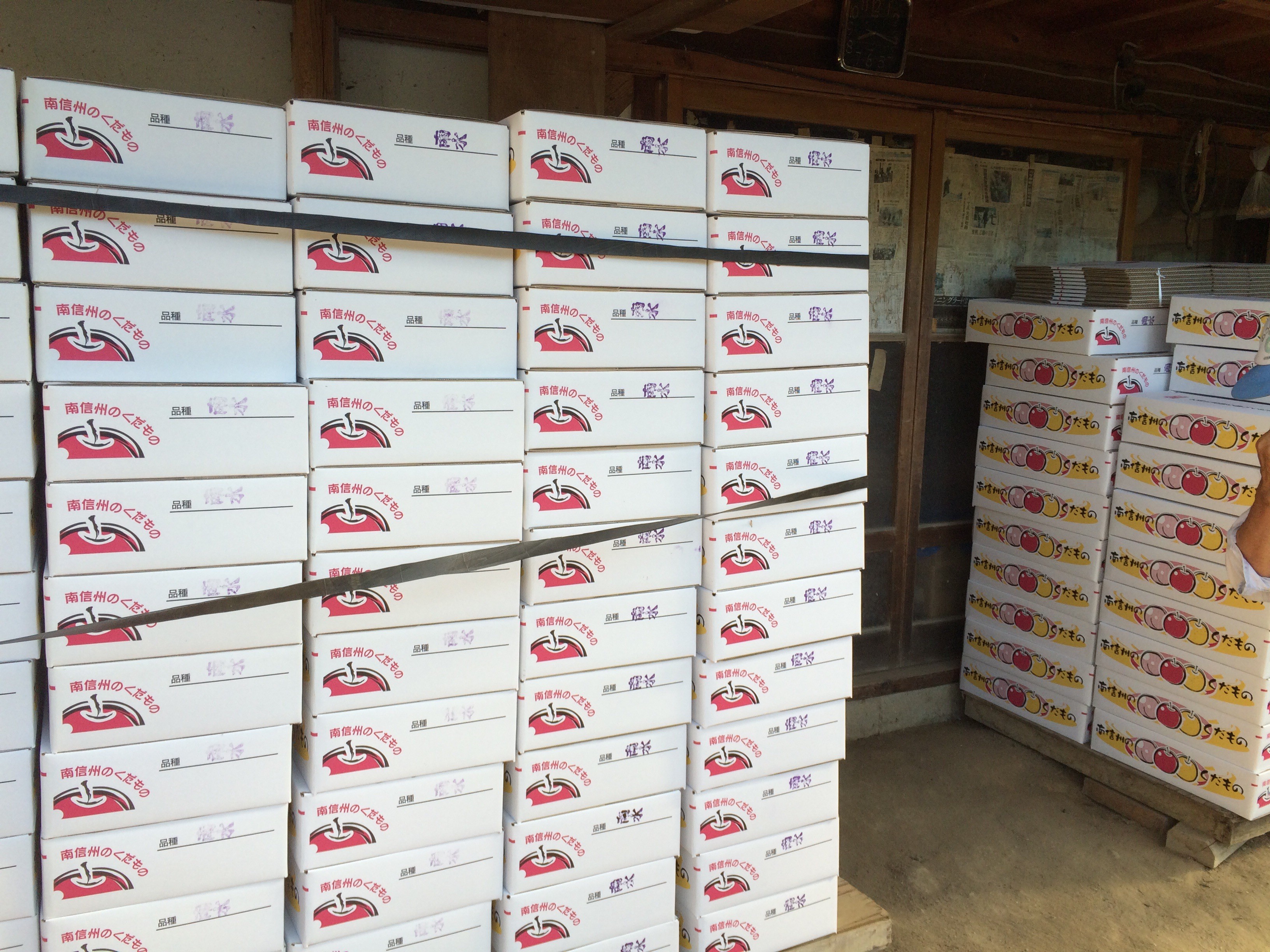 そこには、こんなふうになしの箱が山積みになっていました。それを2台のトラックに積んで運び出します。朝から汗だくの作業でした。