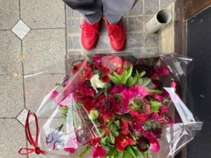 ↓赤い靴、赤い花を基調にした花束。