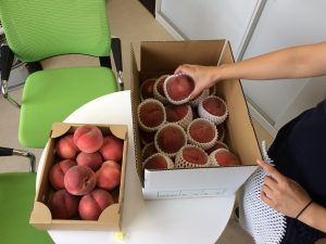 ついに今週こんなお土産が・・・。朝礼時に、黄色い歓声があがりました。「川中島白桃」かわなかじまはくとう・・・この響きいいですね。高級桃ブランドです。実家が桃農家の女子社員が土日にお手伝いに帰っていて、こんなお土産をくれました。ちょっと傷ついたので、JAに出荷できないという桃のようですが、どう見ても全然問題にならないような品質のものばかり。