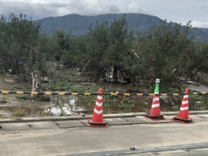 国道から農村地帯に入ると、一面に広がる、りんご畑は、壊滅的な被害です。このあたりは、水深3mを超えていた地域です。
