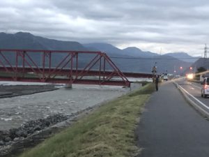 ごらんのとおり、赤い鉄橋が崩落したままです。朝早くから河原には、重機が何台も出て、復旧活動をしていましたが、この赤い鉄橋は、手付かず状態です。