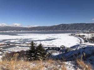 諏訪湖もまる~い、現在、3年ぶりに全面結氷されており、御神渡りが期待されています。
