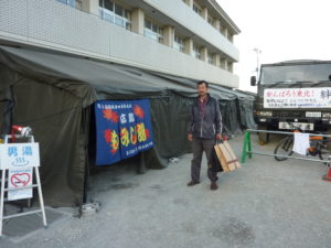 ↑地元の人とボランティアのみ入れる自衛隊が用意してくれたお風呂に入り、夜はハイゼットで寝ました。お風呂は、小学校の校庭に、広島から来ていた自衛隊の部隊が「もみじ湯」というのれんを掲げていました。自衛隊の活躍を目の当たりにして、この国に誇りを持つことができました。