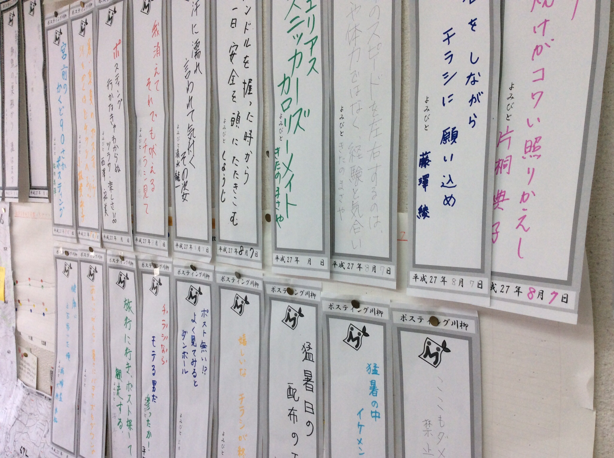 当社の会議室は、現在こんな感じです。壁一面に社員が詠んだ川柳が貼りだされています。