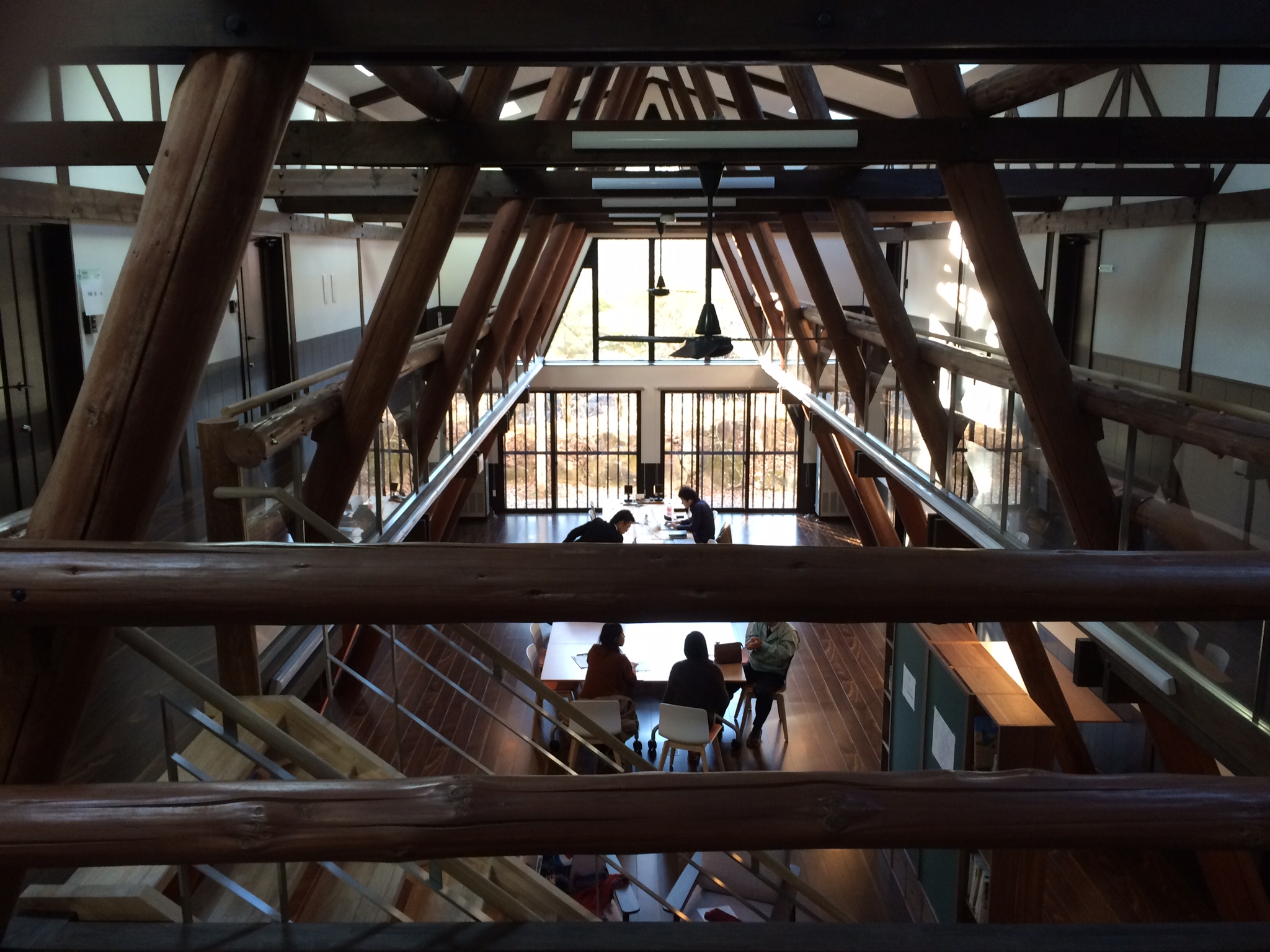 ここは、その昔、東京の大学のセミナー施設だったようです。木の香りがするおしゃれな働く場所(コワーキング)へと変身しました。現在、東京のIT企業などが数社サテライトオフィスとして入居しています。外観と内部はこんな感じです。