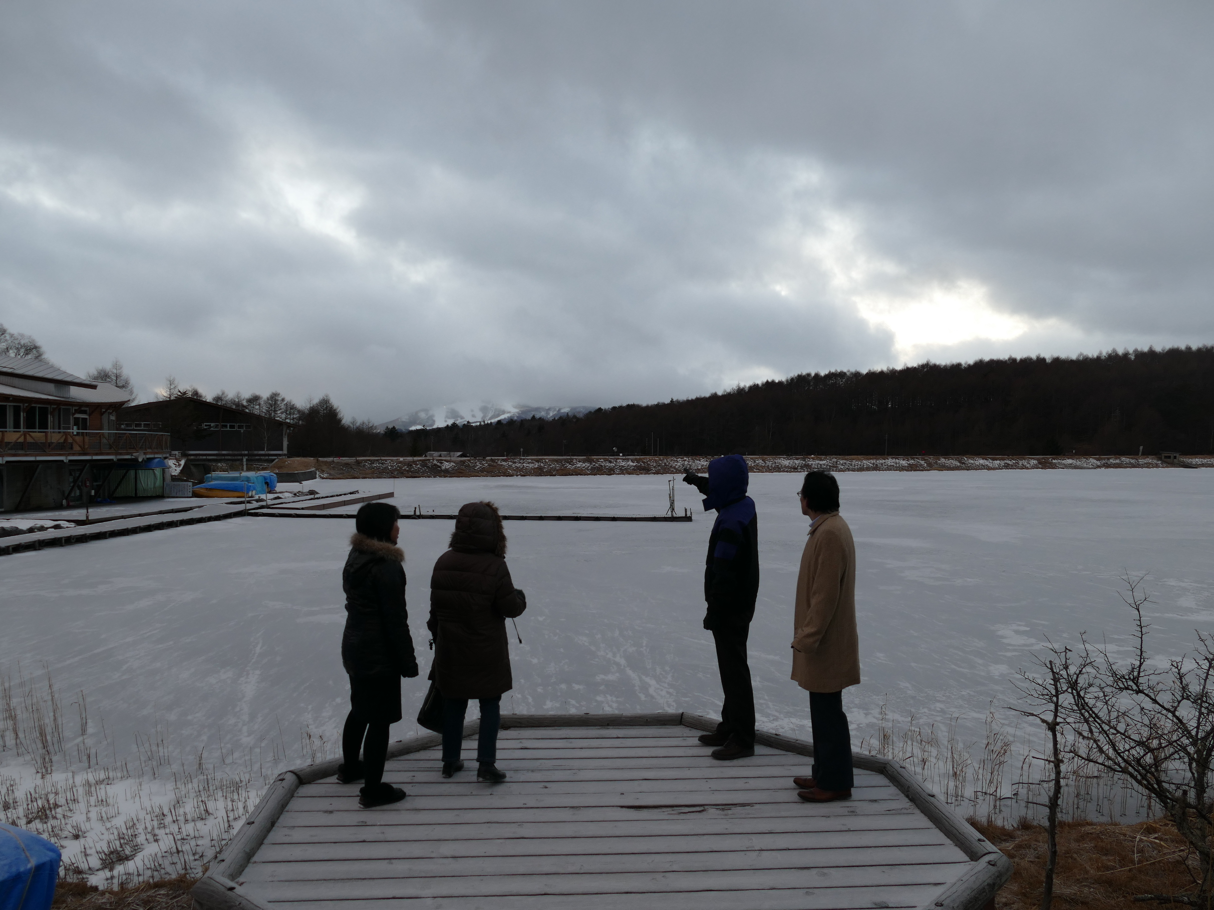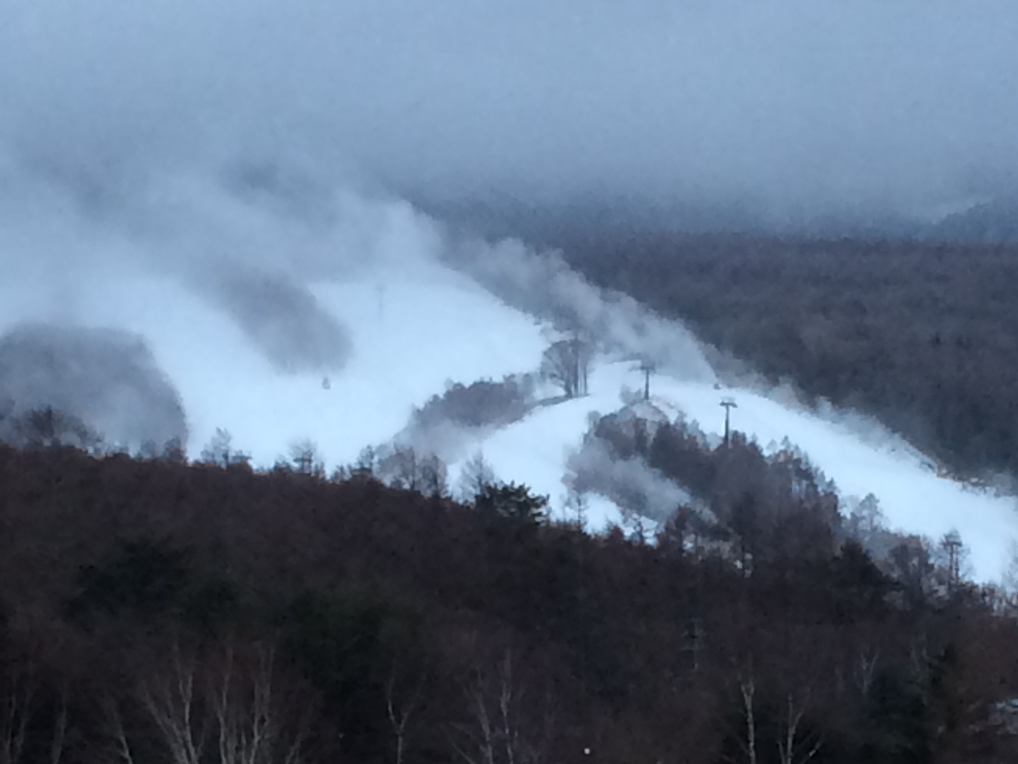 翌朝はやく、一部の社員は湖一周を観光しました。暖冬でしたが、この日は氷点下3度くらいだったと思います。近くのスキー場では、早朝から降雪機がフル稼働でした。