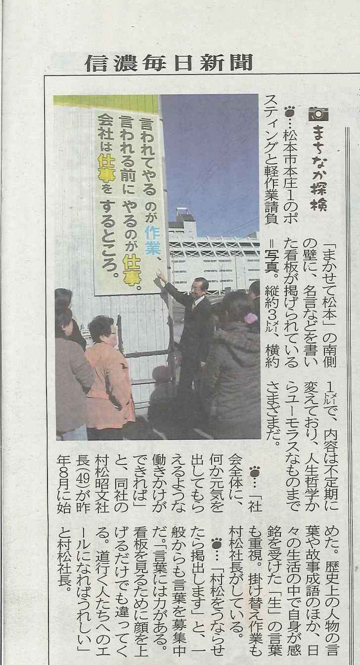 松本平タウン情報に記事掲載 ニュース&最新情報 2012年2月3日 2026 02.03 松本平で信濃毎日新聞に折り込まれている「松本タウン情報」1月31日付けの紙面に 弊社の看板についての記事が掲載されました。 共有:Tweet